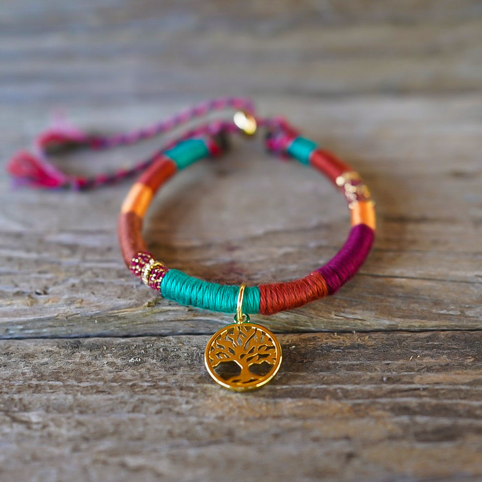 Handmade color full braided cotton cord and waxed cord bracelet. The bracelet has a 18k gold plated tree of life charm.