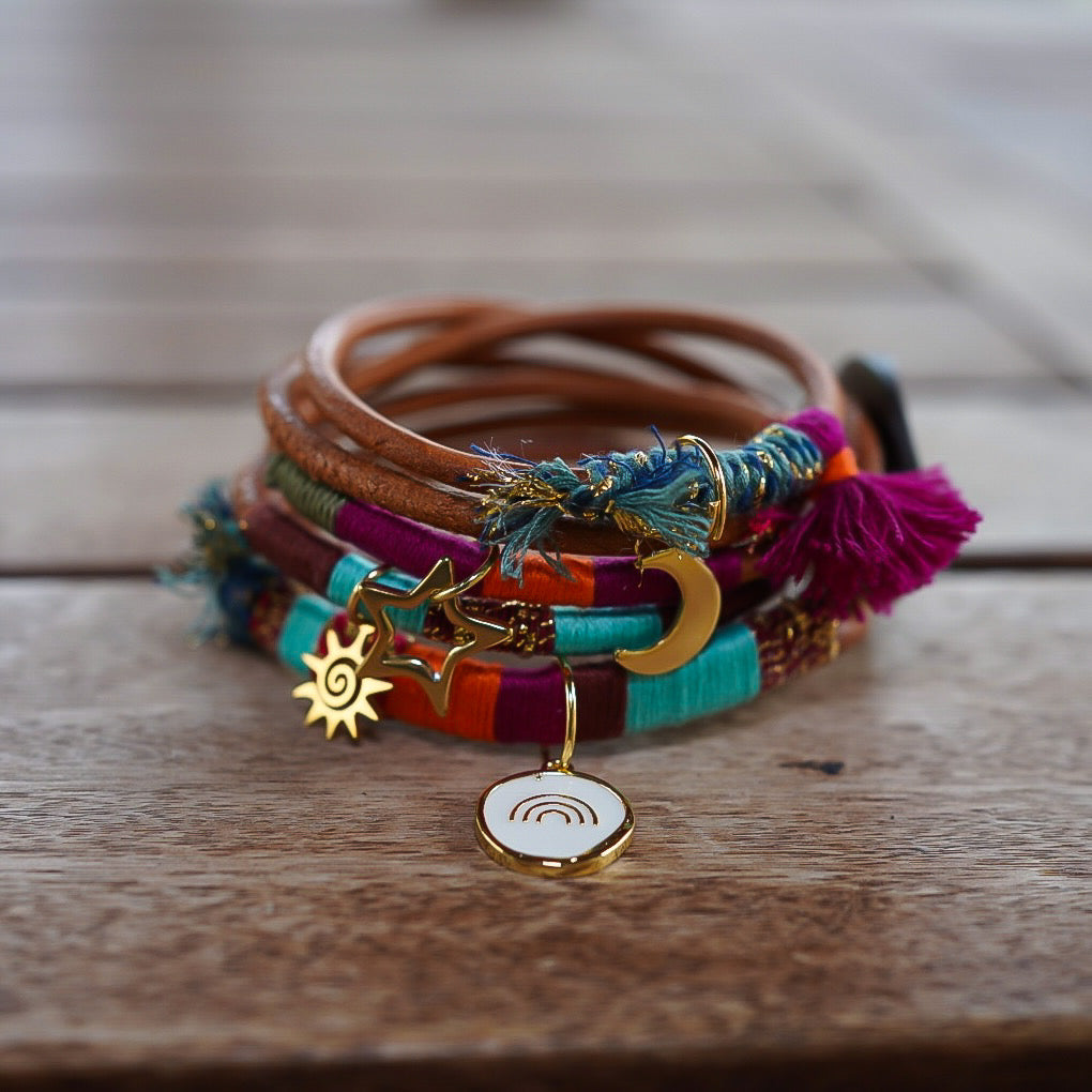 Pulsera de cuero marrón natural hecha a mano con hilos tejidos en colores contrastantes. La pulsera da tres vueltas a la muñeca. Cuenta con dijes bañados en oro de 18k y esmaltados.