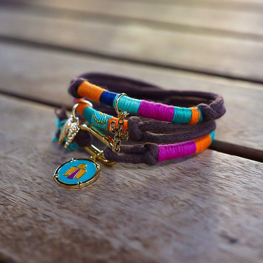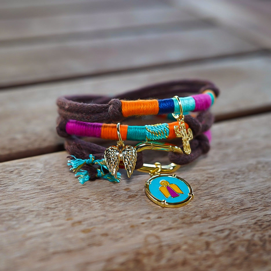 Pulsera de cordón tejido a mano. La pulsera tiene un dije de angel esmaltado bañado en oro de 18k y un dije de alas de ángel bañada en oro de 18k. El cierre está bañado en oro 18k