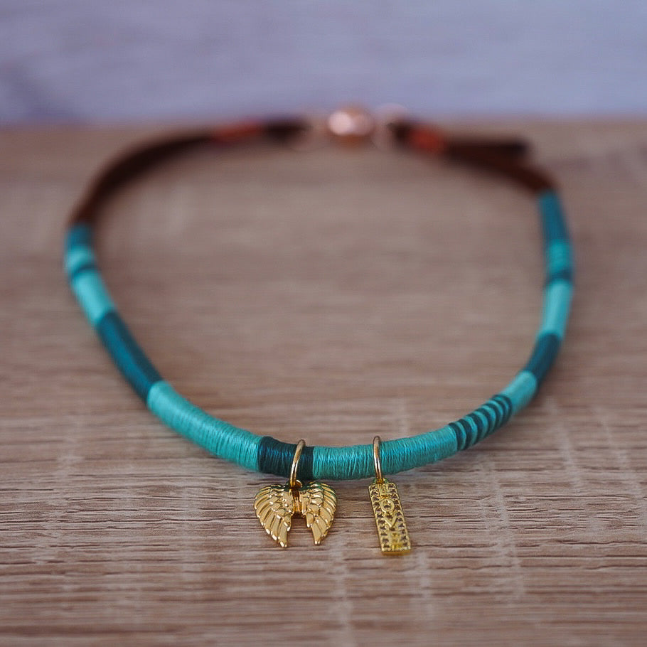 Preciosa gargantilla tejida con dijes bañados en oro de 18k. El botón del extremo es un cierre magnético bañado en oro rosa de 18k.