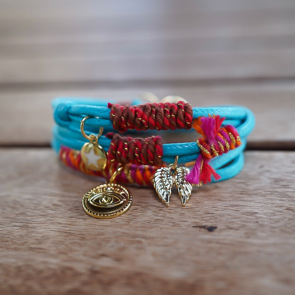 Pulsera con detalles tejidos a mano sobre cordón 3mm azul oscuro.