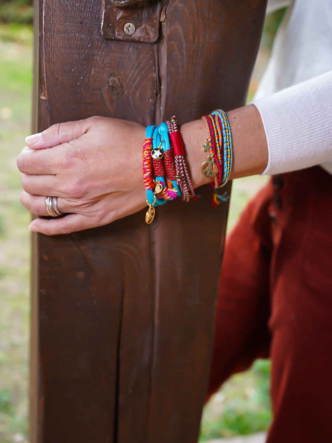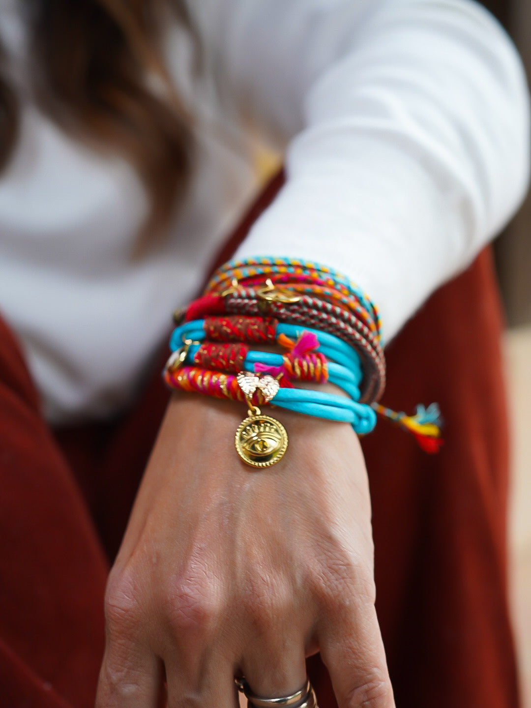 Los siete charms están chapados en oro de 18k y esmaltados. En el extremo, un cierre magnético chapado en oro de 18k.
