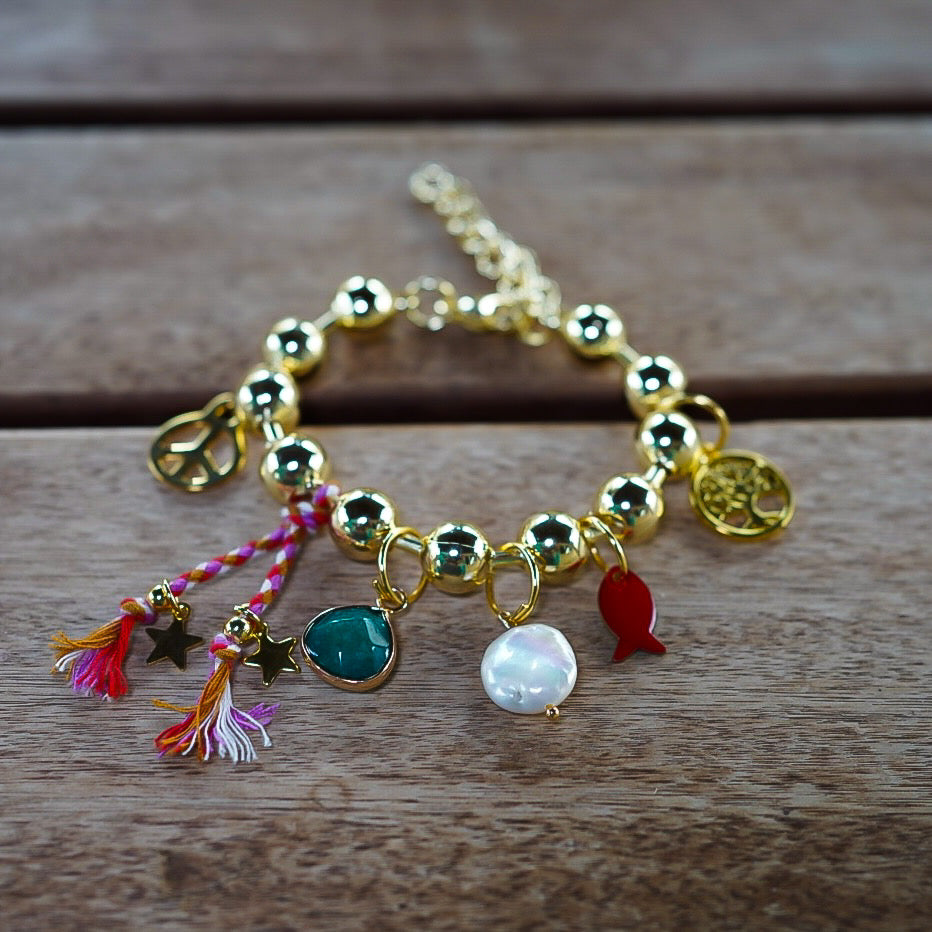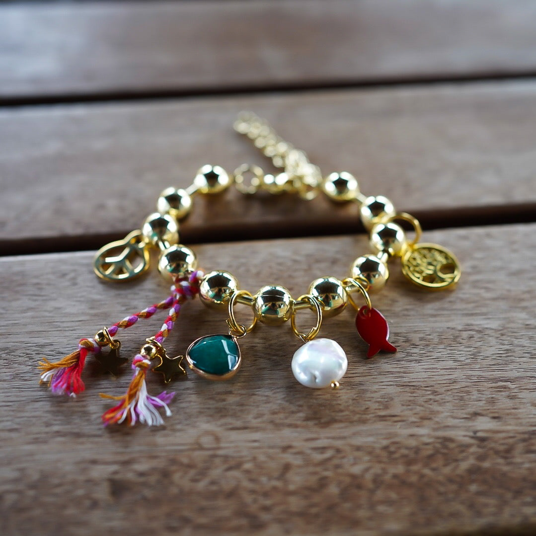 18k Gold plated military bracelet. The bracelet 18k gold plated charms, a red enameled fish charm, a teal crystal charm, and one natural shell charm.
